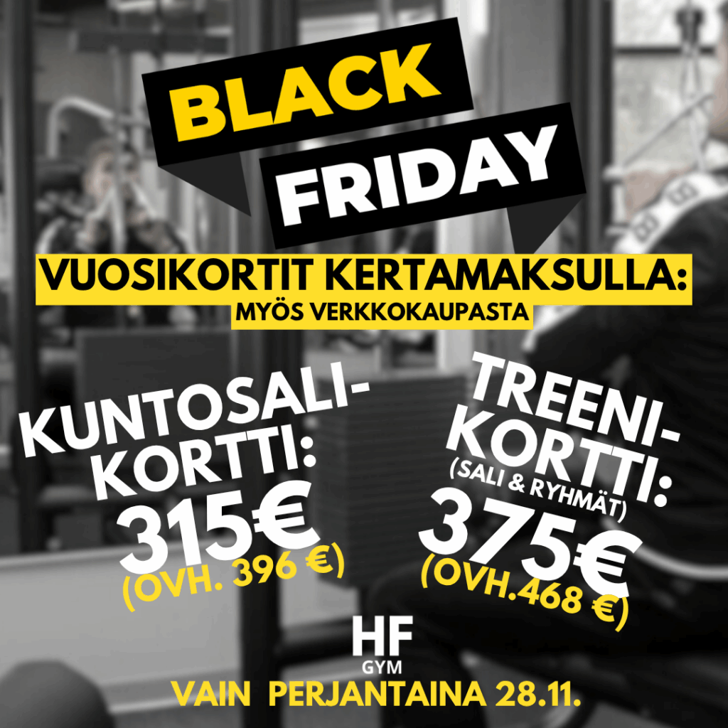 Tule hyödyntämään vuoden edullisin KUNTOSALI- tai TREENIKORTTITARJOUS, kertamaksulla koko vuosi joko 315€ (pelkkä sali) tai 375€ (sali&ryhmät). Saatavilla vain perjantaina 28.11., paikan päältä tai verkkokaupasta, vain kertamaksulla!
